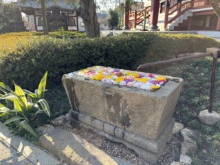 新年を迎えるにあたり、新しく設えた花手水にて皆様をお迎えしております。